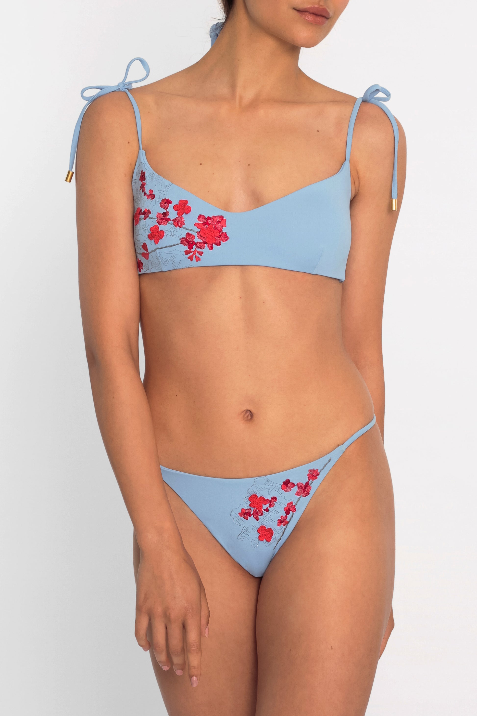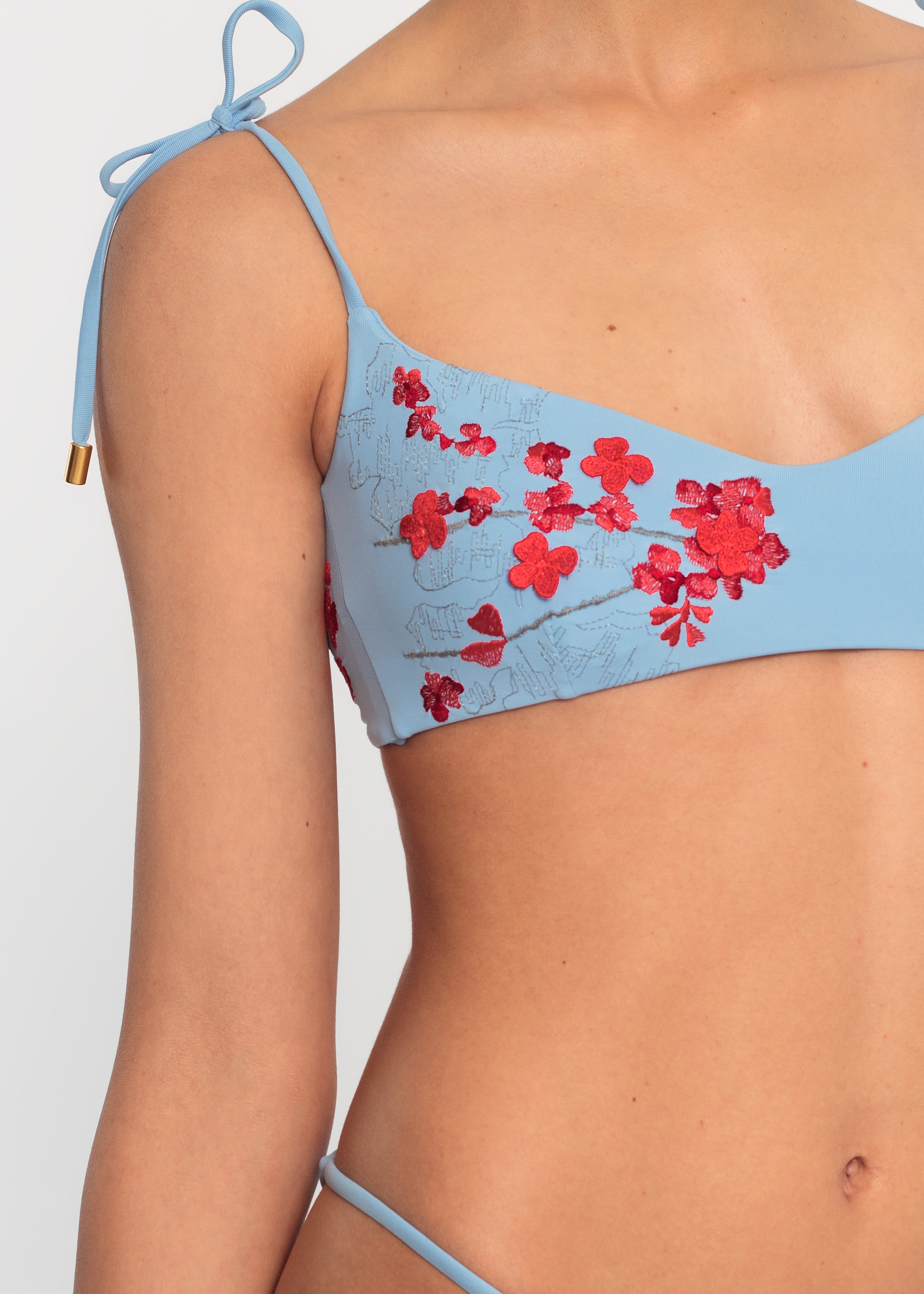 Light blue bikini with coral embroidery. 100% Made in Italy fabric (86% Polyamide 14% Elastene).