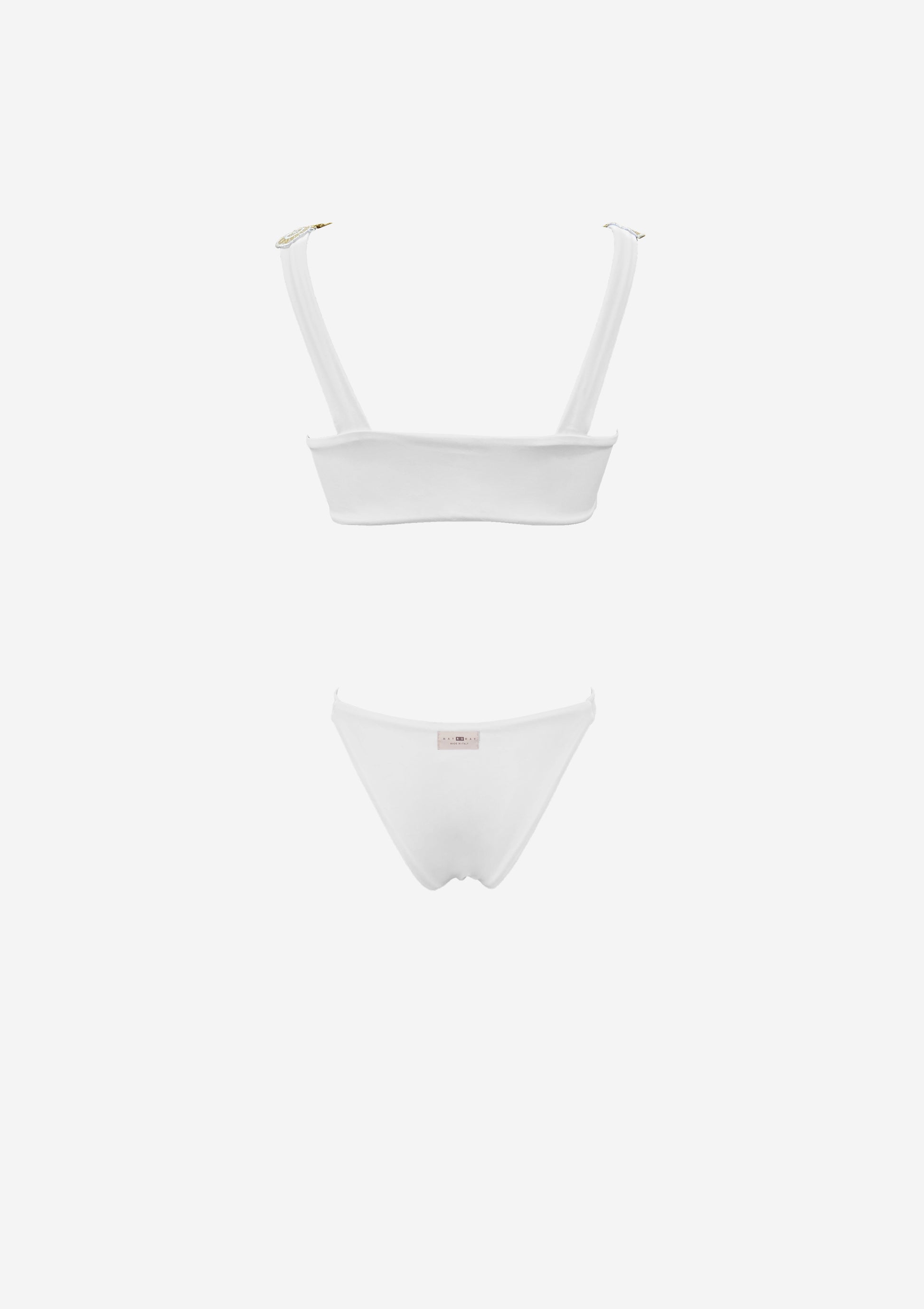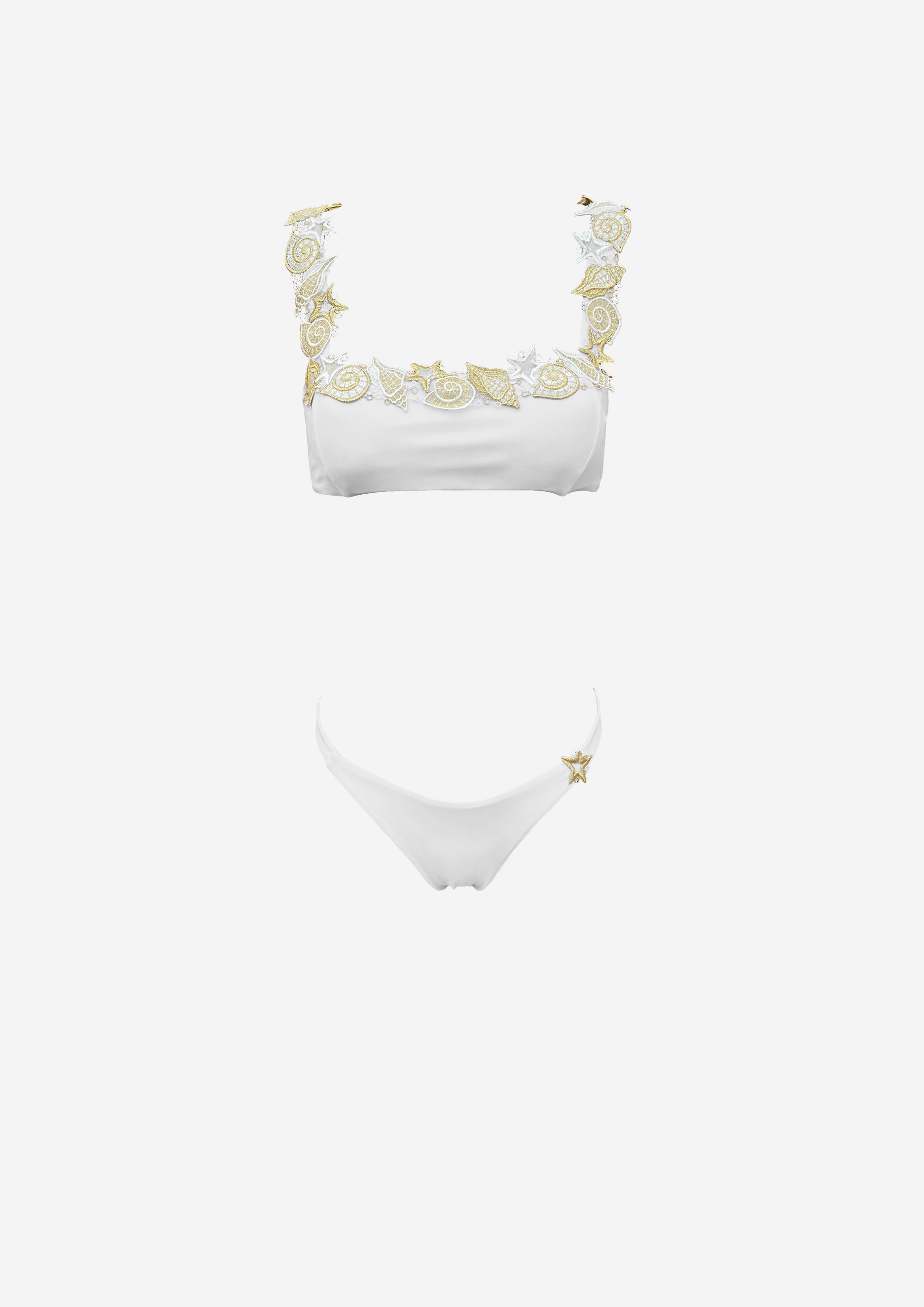 Selene, Made in Italy, white bikini with matching white / gold marine embroidery.