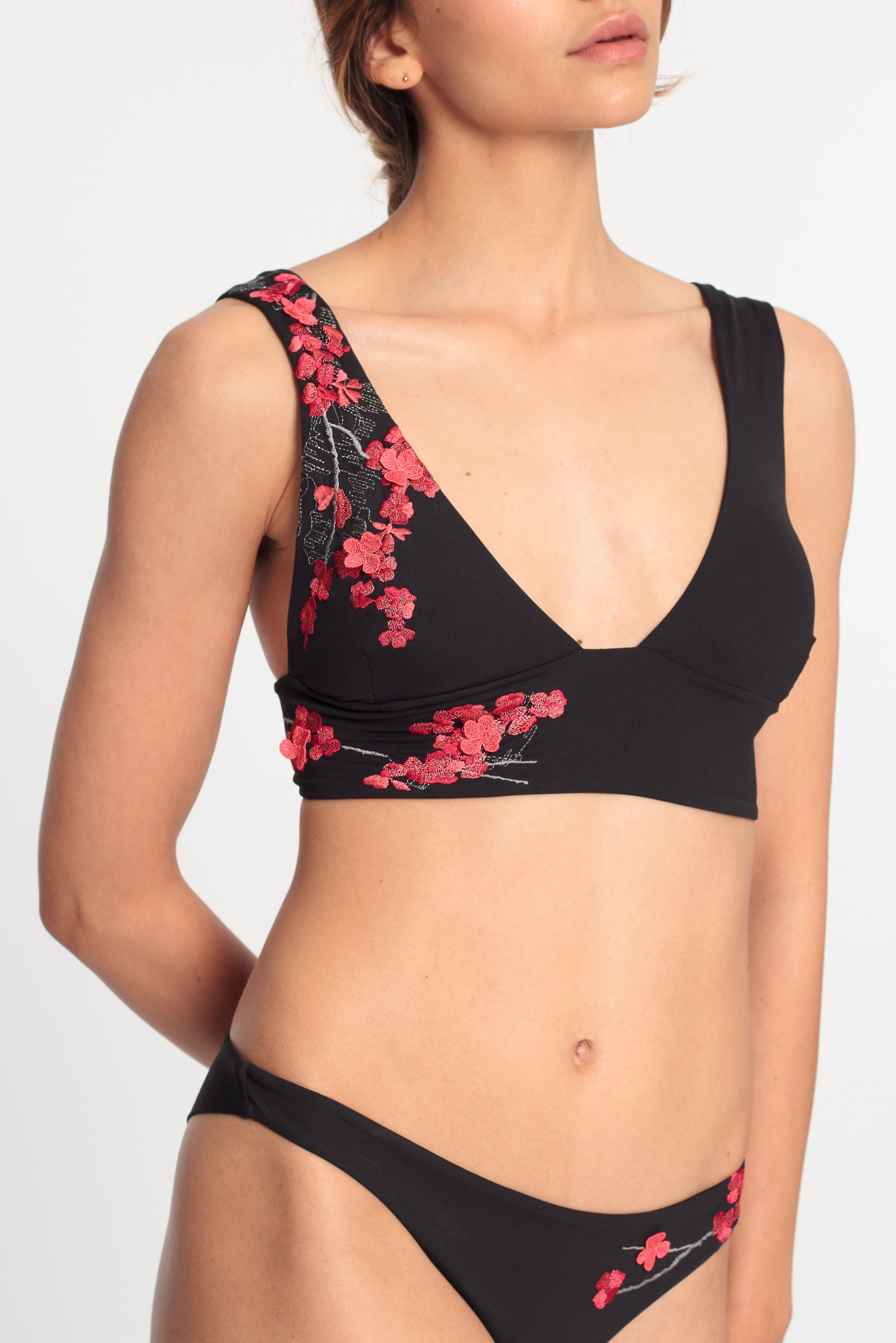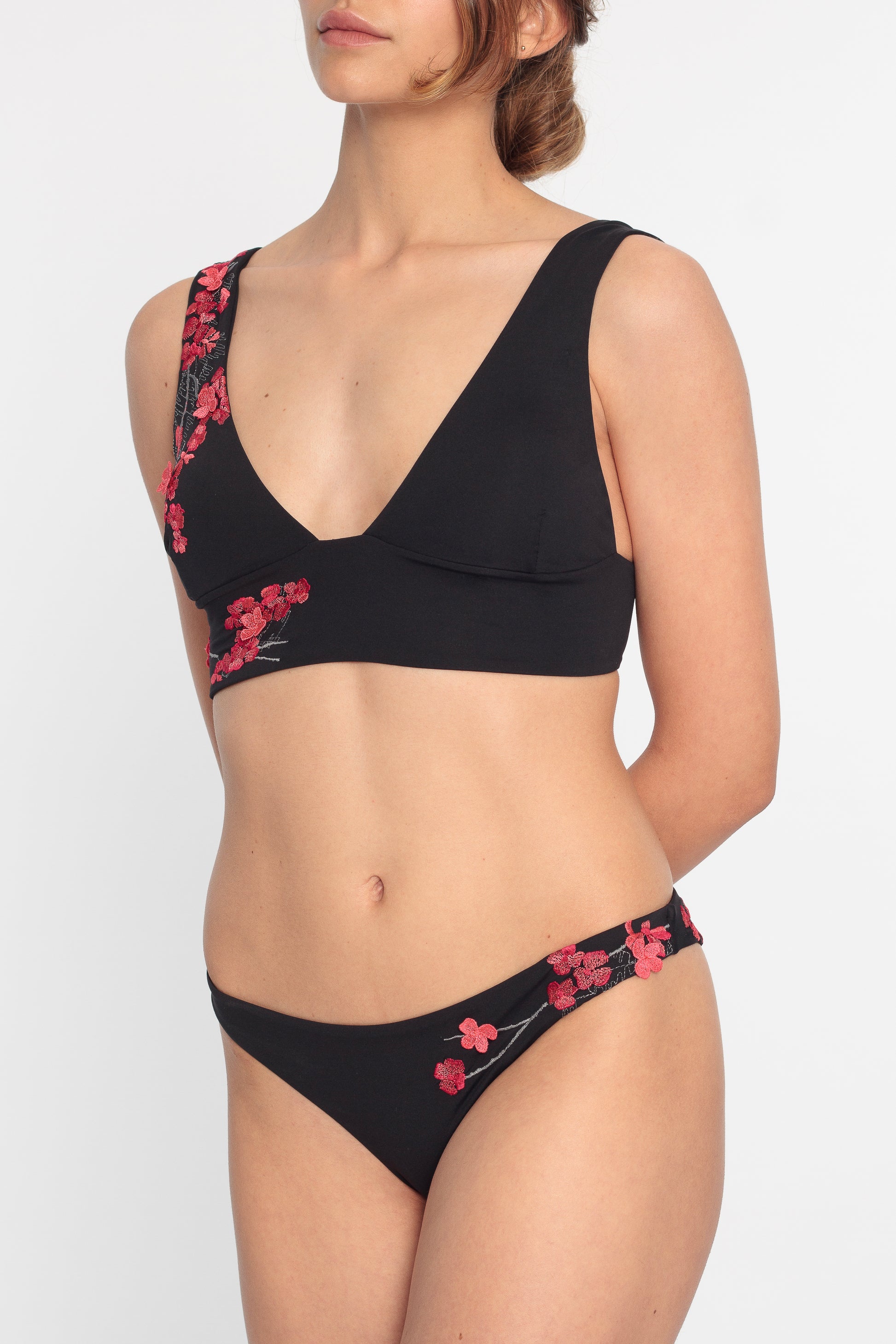 Bikini nero con ricamo color corallo. Tessuto 100% Made in Italy (86% Polyamide 14% Elastene).