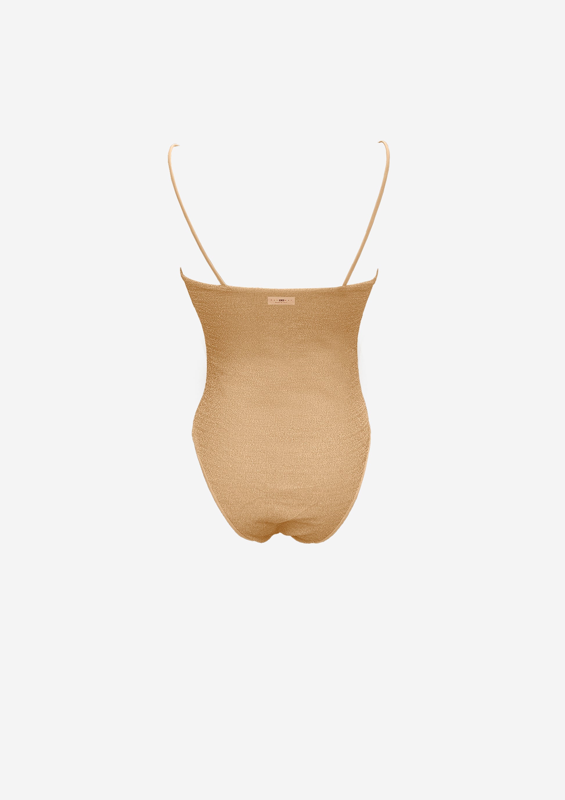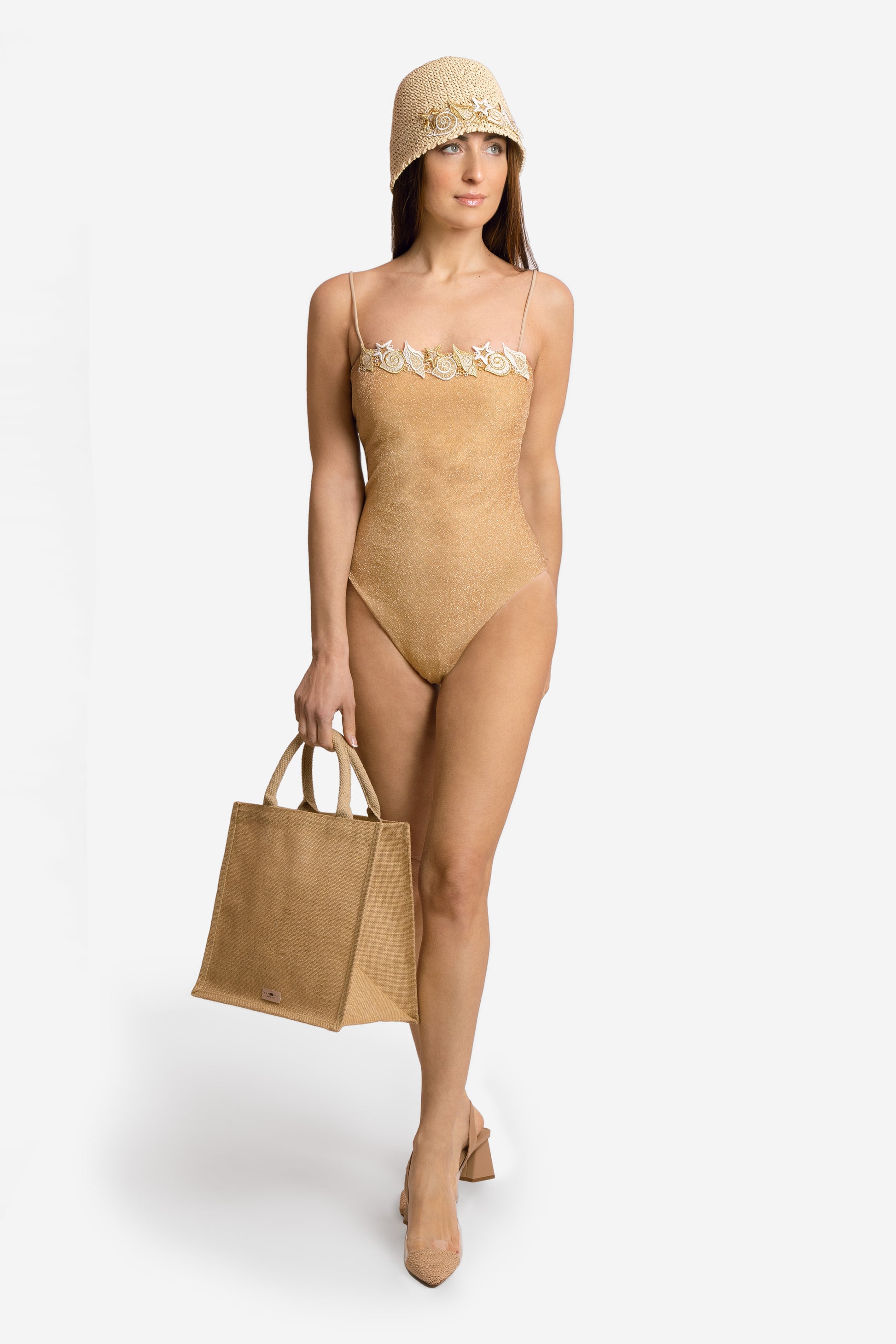 Lena, Made in Italy, costume da bagno intero in lurex oro con ricamo marino.
